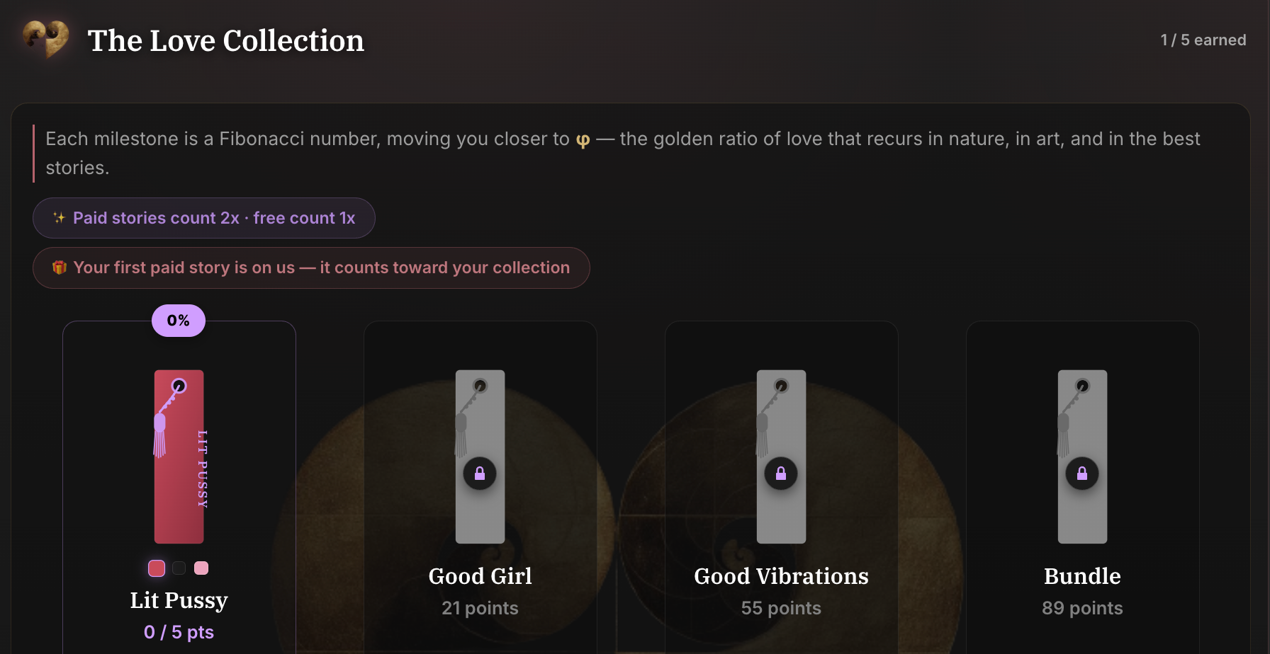 The final tier is called Phi-nish (I'm especially proud of this one.) The reader isn't just completing a milestone - they're arriving at the phi of love. The completion of something that started with the simple act of picking up a story.
