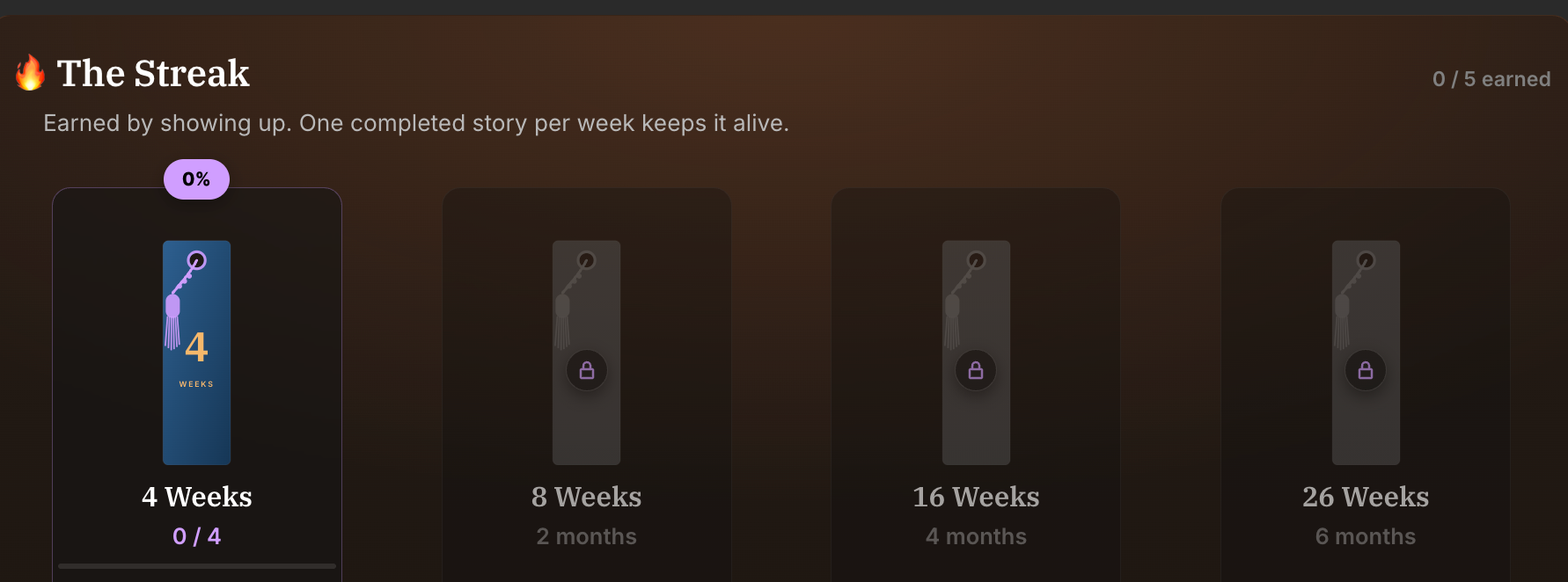 Alongside the collection, we're also tracking your weekly reading streak. Finish at least one story every week, and your streak keeps climbing. Hit milestones at 4 weeks, 8 weeks, 16 weeks, a year, and you earn Streak bookmarks, a different set designed for consistency.